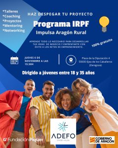 Adefo Cinco Villas colabora con el Programa Impulsa Rural Aragón. Se trata de un programa totalmente financiado por INAEM y gestionado por la Fundación Piquer, que impulsa el emprendimiento, la innovación y la sostenibilidad en el medio rural.